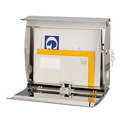 ポスト正面に向かって右側に鍵が設置されています。投入物を取り出す際は、鍵を開けて正面パネルを開きます。